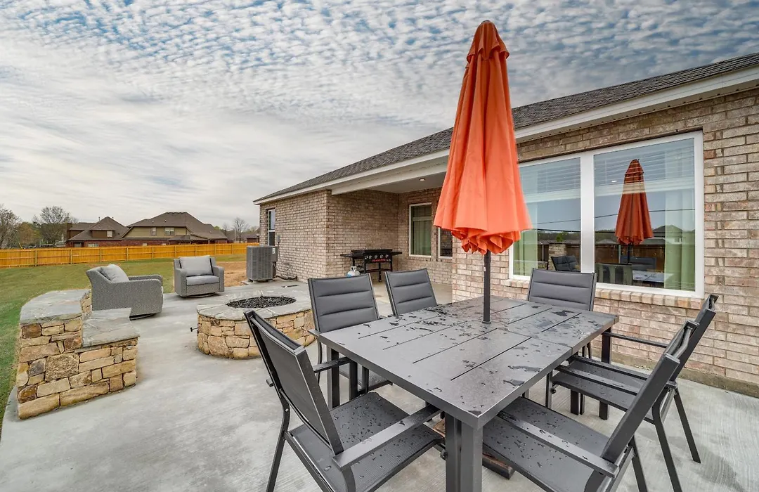 This Broken Arrow property includes an outdoor dining area with a fridge, an oven, and kitchenware.